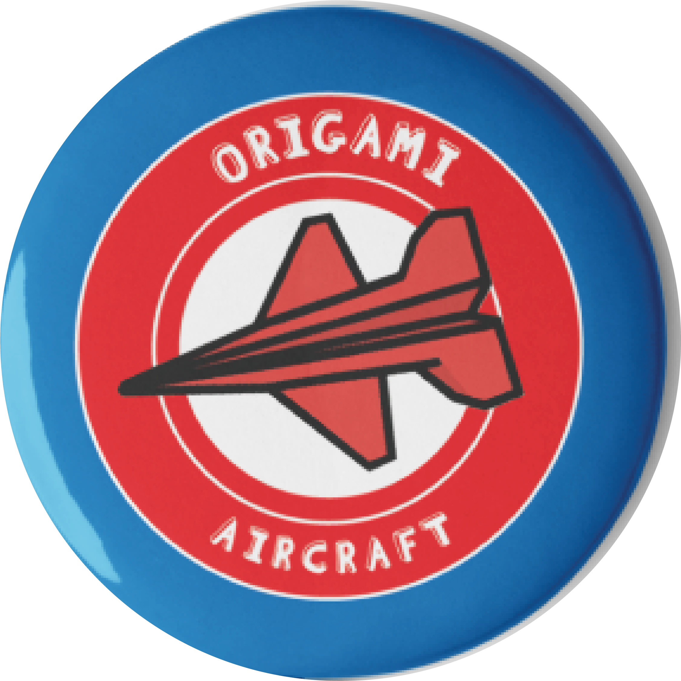 One jet appears in red, another in a grayscale tone, and the third in a slightly darker red and black combination. Consequently, the button pack offers visual variety while staying consistent with the theme. The word “Origami Aircraft” appears in a curved layout around the center ring. This reinforces the focus on paper-based aviation.